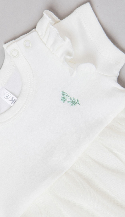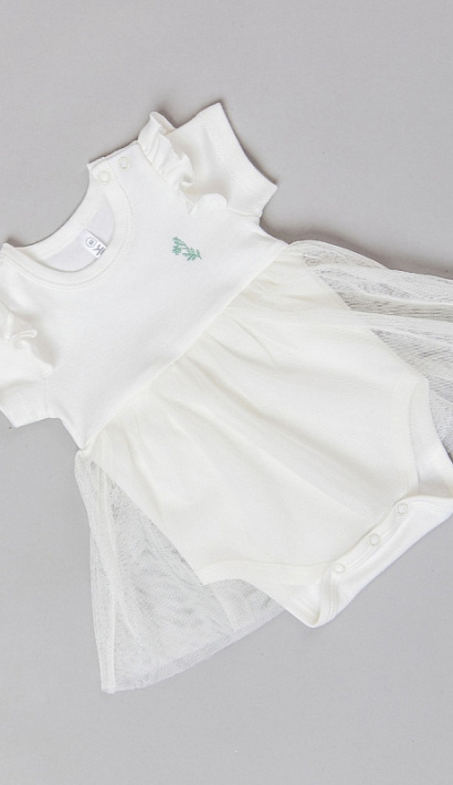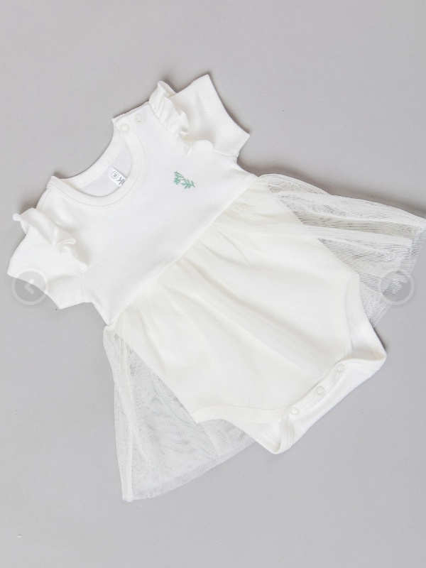 Боди с коротким рукавом для девочки белый. Детский боди из трикотажного полотна (интерлок, 100%хлопок) с застежкой по плечевым сгибам на 2 кольцевые кнопки и с застежкой по нижнему краю на 3 кольцевые кнопки. Горизонтальный подрез по линии талии, в который с присбориванием вшита юбка из фатина.