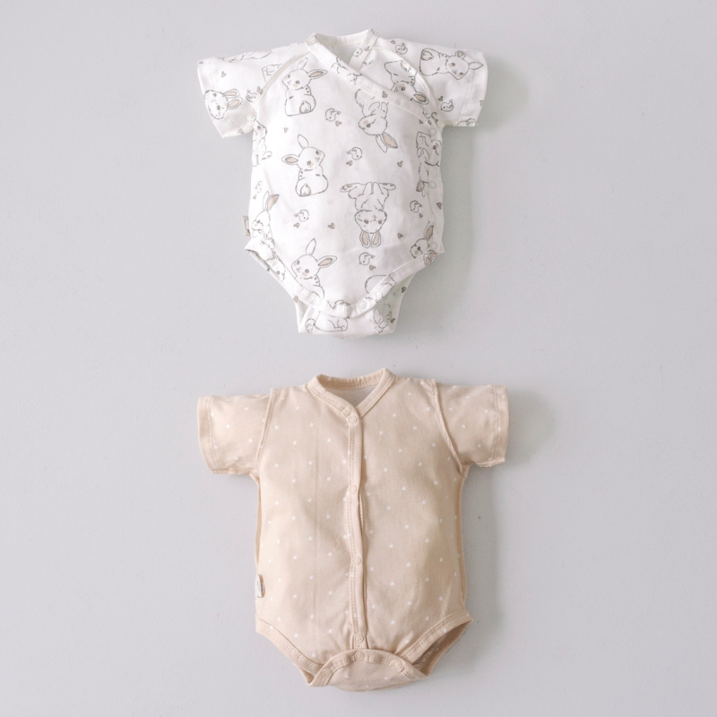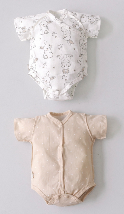 Одно боди имеет застежку на кнопки спереди и снизу для смены памперса. Второе - с запахом, с кнопочками наискосок.
