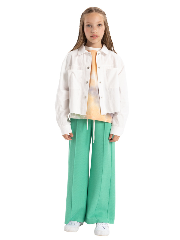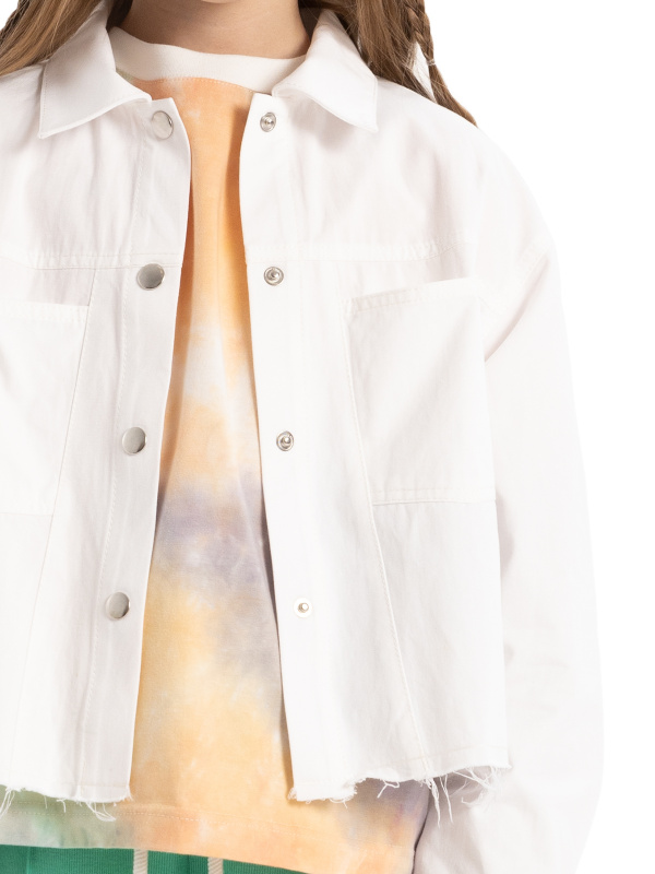 Укороченная куртка-джинсовка в стиле оверсайз из плотного хлопка, застежка на кнопки, воротник с цельнокроеной стойкой, спущенное плечо, длинные двухшовные рукава с притачными манжетами и застежкой на кнопку, на полочках кокетка, рельефы и два кармана, на спинке кокетка, необработанный нижний срез.