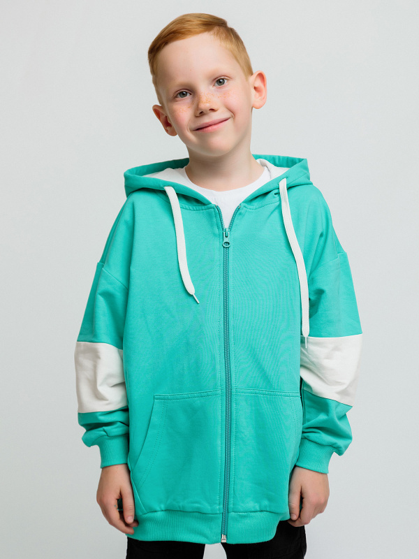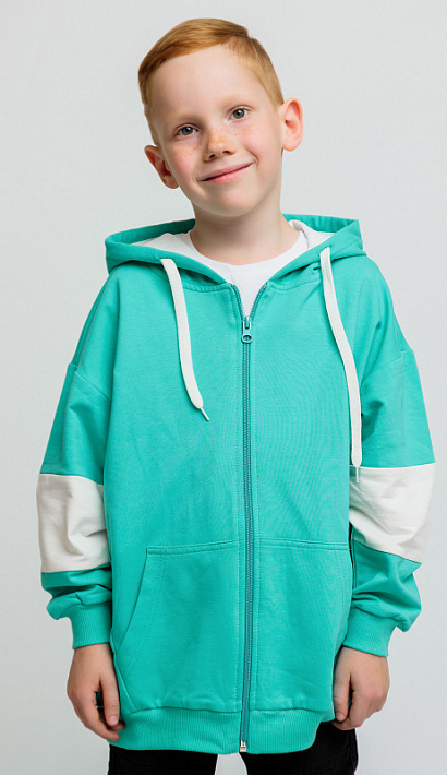 Толстовка для мальчика в мятной расцветке из футера с капюшоном и боковыми карманами. Состоит из хлопка и эластана. Качественная молния-застежка, эластичные манжеты рукавов, свободный крой.