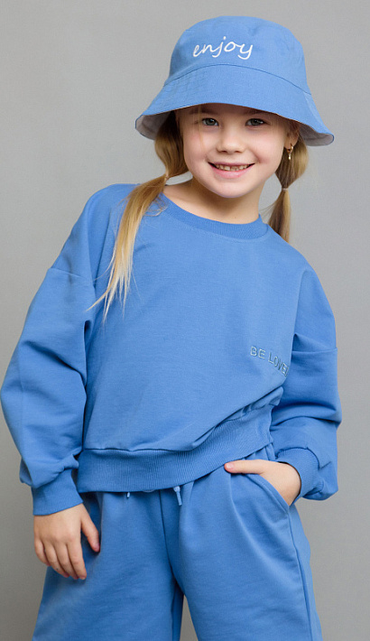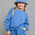 Свитшот укороченный детский в голубом цвете из футера. Стильная и удобная модель для мальчика и девочки с вышитой на груди надписью в тон основному оттенку. Манжеты рукавов и низ эластичные.