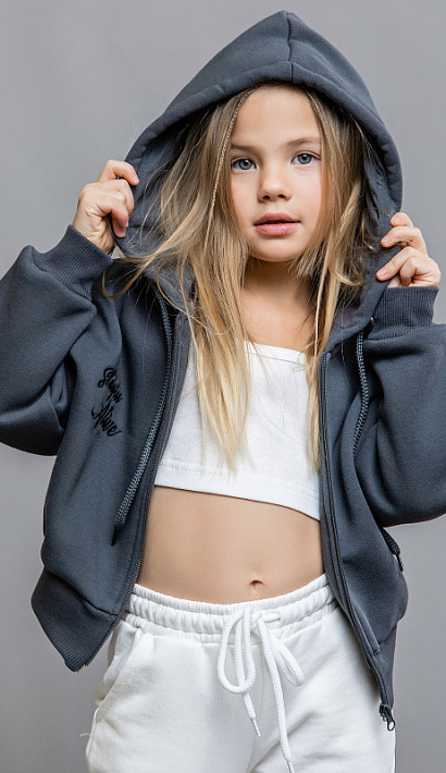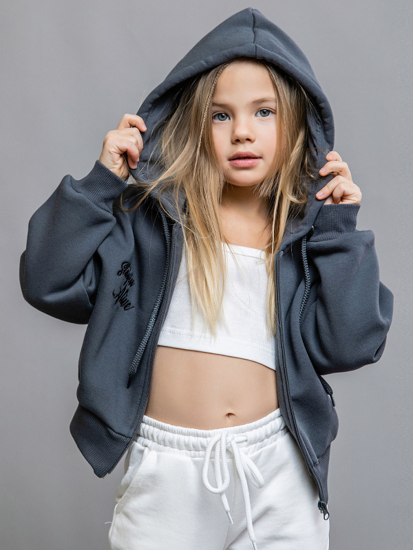Толстовка укороченная графит детская из футера с капюшоном. Детская толстовка выполнена из 90% хлопка, имеет мягкие эластичные манжеты и низ. Стильная толстовка на молнии подойдет для повседневной носки. Отлично сочетается со спортивными брюками и шортами.