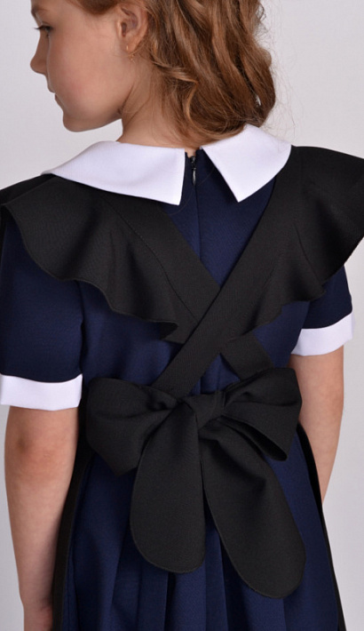 Школьный нежный фартук из ткани "габардин", с рюшами. В нагруднике кармашек. Бретели удобно регулируются на пуговицах. Пояс завязывается на пышный бант.