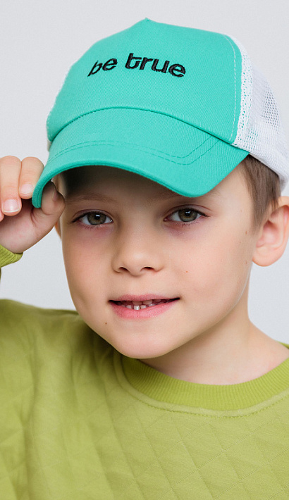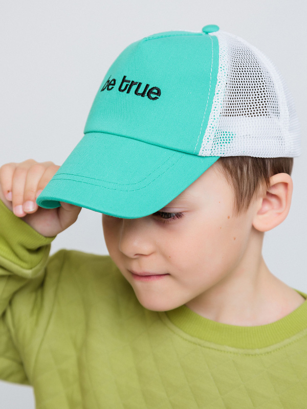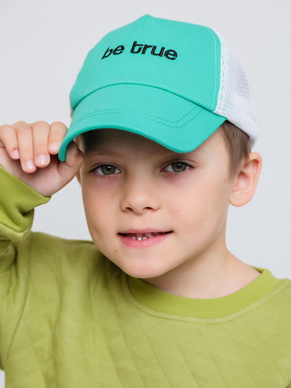 Бейсболка для мальчика бело-бирюзовая с вышивкой в виде надписи. Кепка из хлопка убережет голову от палящего солнца и перегрева. Состоит из экологически чистых материалов.