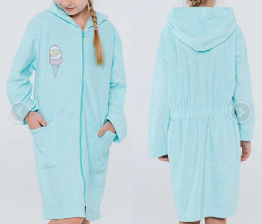Халат для девочек. Свежая мятная расцветка и вышивка в виде мороженки создают уютный домашний образ.
