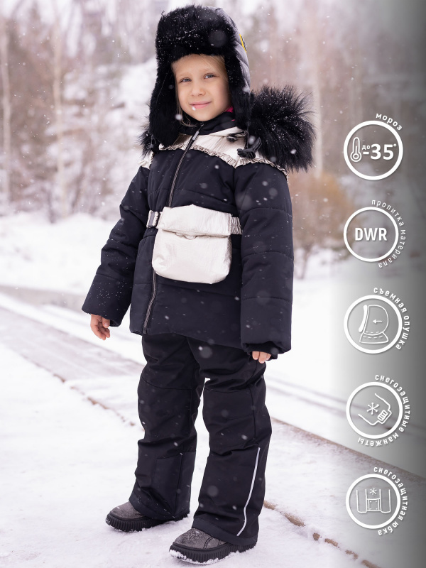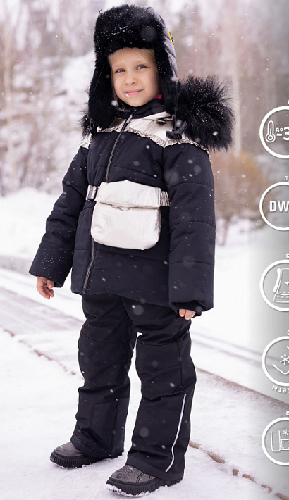 Комплект для девочки Элис зимний утепленный от batik из мембранной ткани с флисовым подкладом. Расцветка черная с блестящими контрастными элементами. Внутренние трикотажные манжеты в рукавах куртки хорошо прилегают к запястьям. Модель имеет пояс с сумкой, в которой можно хранить все самое необходимое для прогулок и поездок за город.