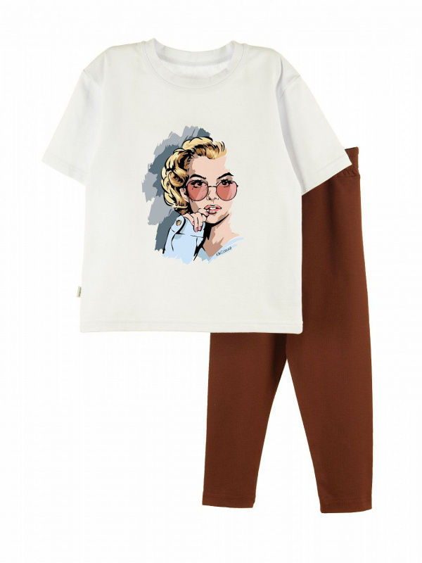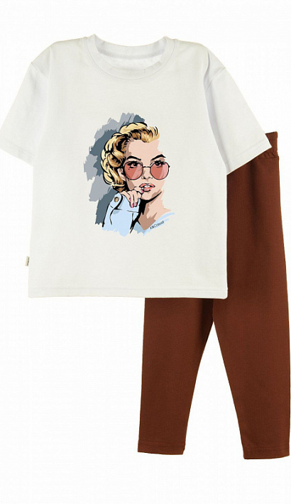 Футболка силуэта оверсайз со спущенной линией плеча. Спереди классный принт. Леггинсы облегающие, длинные. Изготовлен костюм из футболочного полотна с эластаном. Отлично подходит для детского садика и в качестве одежды для дома.