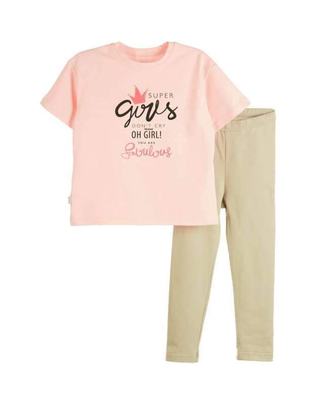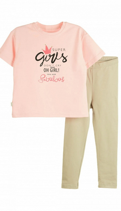 Комплект для девочки состоит из футболки и легинсов. Футболка для девочки силуэта оверсайз со спущенной линией плеча. Спереди классный принт. Легинсы облегающие, длинные. Костюм для девочки изготовлен из кулирки с эластаном (92% хлопок, 8% эластан), идеально подходит для активного образа жизни вашей маленькой принцессы. Мягкий, уютный и стильный костюм для девочки легко будет применим для прогулок, сада и активного отдыха.
