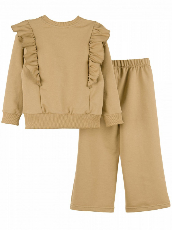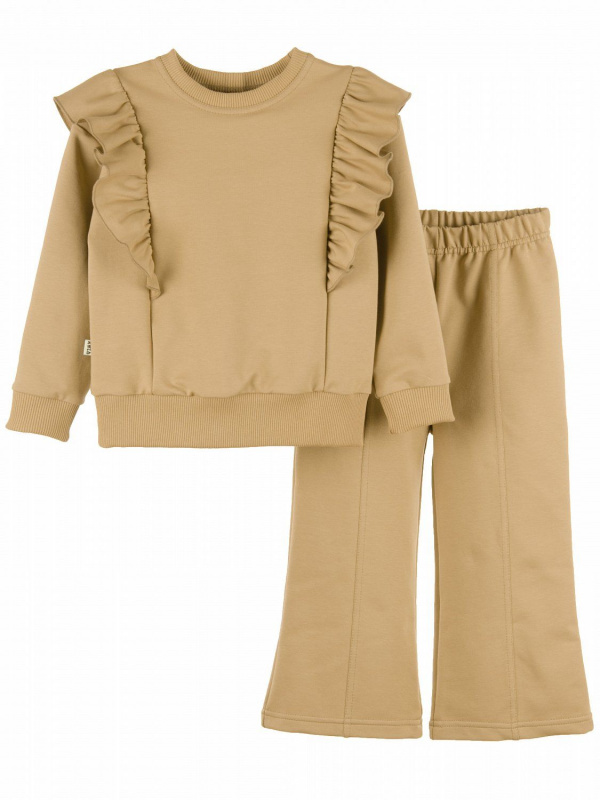 Комплект для девочки KUZA состоит из свитшота и брюк. Свитшот для девочки на манжетах из кашкорсе. Спереди декоративные рюши. Брюки для девочки средней посадки, расклешеные к низу, по переду брюк декоративная отстрочка. Комплект изготовлен из 2-х ниточного петельчатого футера с полиэстером (80% хлопок, 20% полиэстер). Костюм для девочки прост в уходе, выдерживает максимальное количество стирок, не изнашивается и не теряет форму.