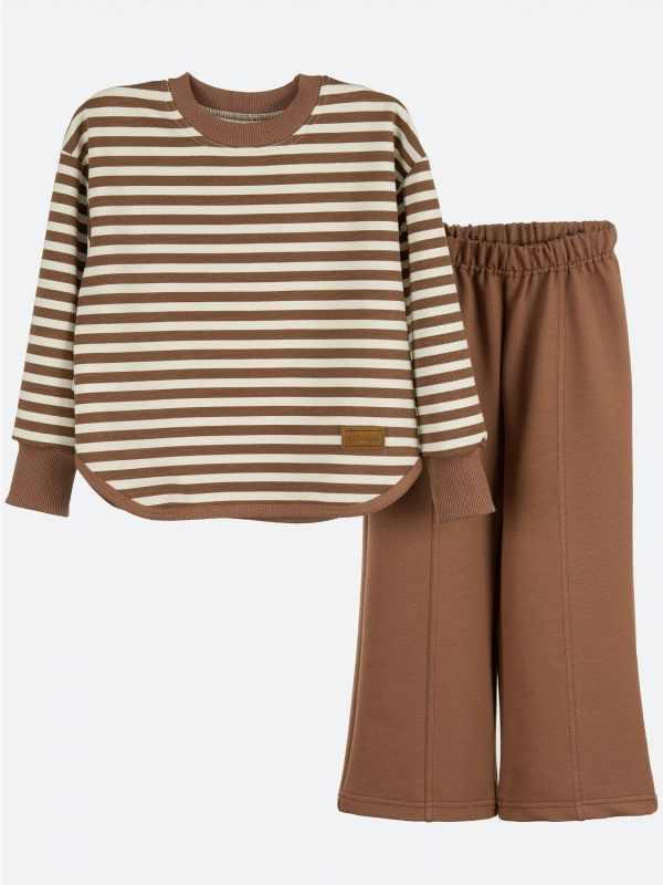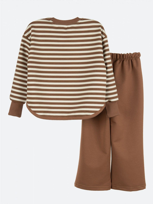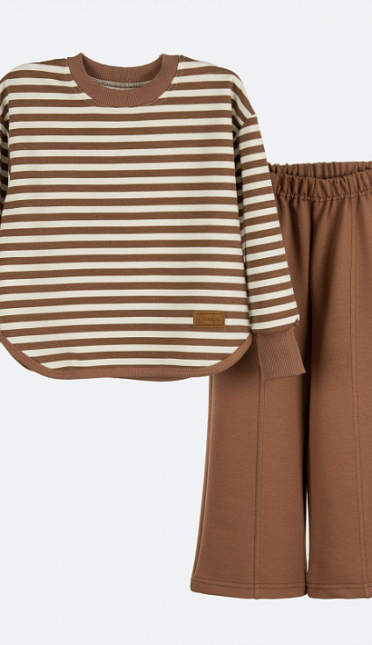 Комплект для девочки KUZA состоит из лонгслива и брюк. Свитшот для девочки на манжетах из кашкорсе в рукавах и горловине, низ обработан бейкой, спереди настрочен брэндовый шеврон. Брюки для девочки средней посадки по переду со стрелкой, расклешенные к низу, без карманов. Комплект изготовлен из 2-х ниточного петельчатого футера без начёса с полиэстером (80% хлопок,20% полиэстер ). Костюм для девочки прост в уходе, выдерживает максимальное количество стирок, не изнашивается и не теряет форму.