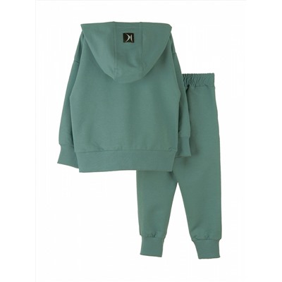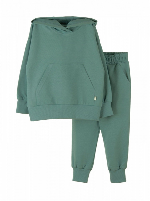 Худи модели "оверсайз", со спущенной проймой, рукав на манжете. По низу худи манжет. Спереди карман "кенгуру". Брюки на манжете, с карманами с отрезным бочком. Изготовлен костюм из петельчатого футера с эластаном.
