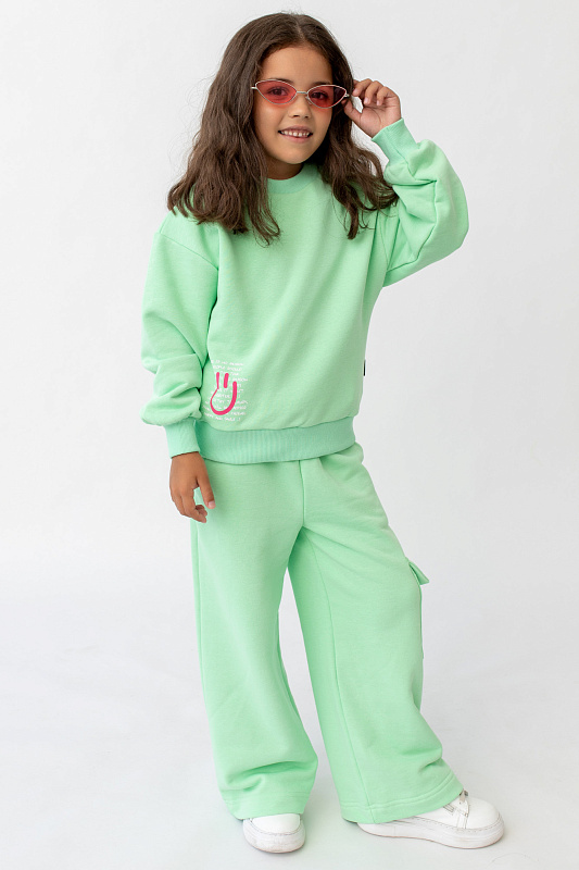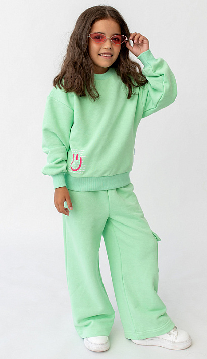 Костюм из плотного мягкого трикотажа с петельной изнанкой. Состоит из свитшота и брюк свободного кро...