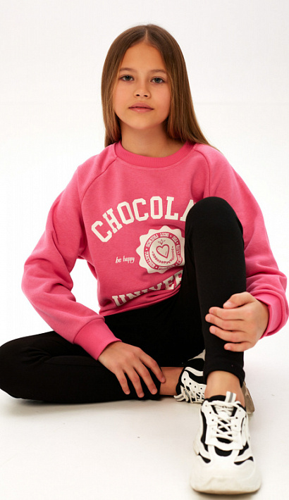 Состоит из удлиненного свитшота свободного кроя, выполненного из мягкого уютного футера с петельной изнанкой и легинсов из эластичного трикотажа.
