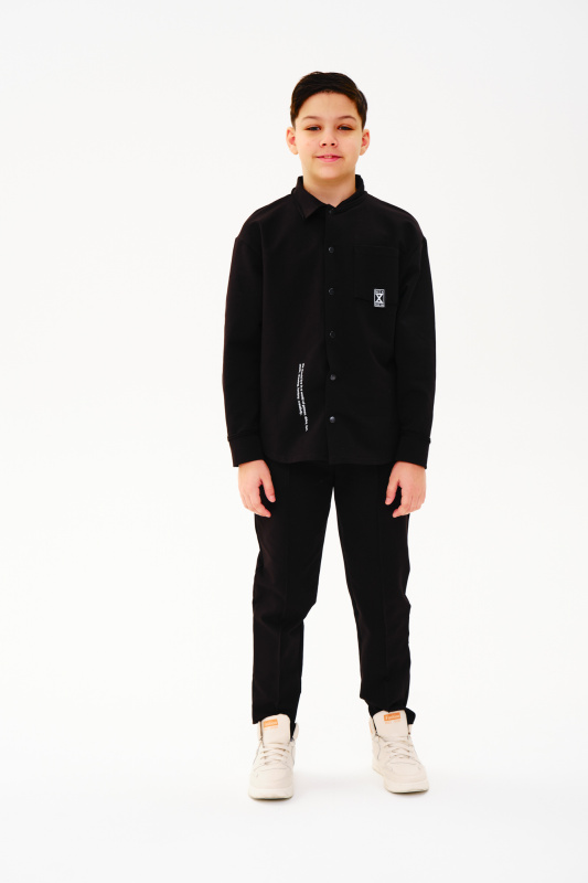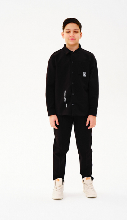 Состоит из рубашки свободного силуэта с имитацией открытых срезов с застежкой на металлические кнопки, и брюк прямого кроя со стрелками на переде.