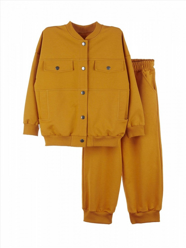 Бомбер на кнопках, с двумя удобными карманами. Широкие брюки-карго на манжетах и карманами с отрезным бочком, пояс внутри с эластичной тесьмой. Костюм из 2-х ниточного футера с эластаном, без утеплителя.