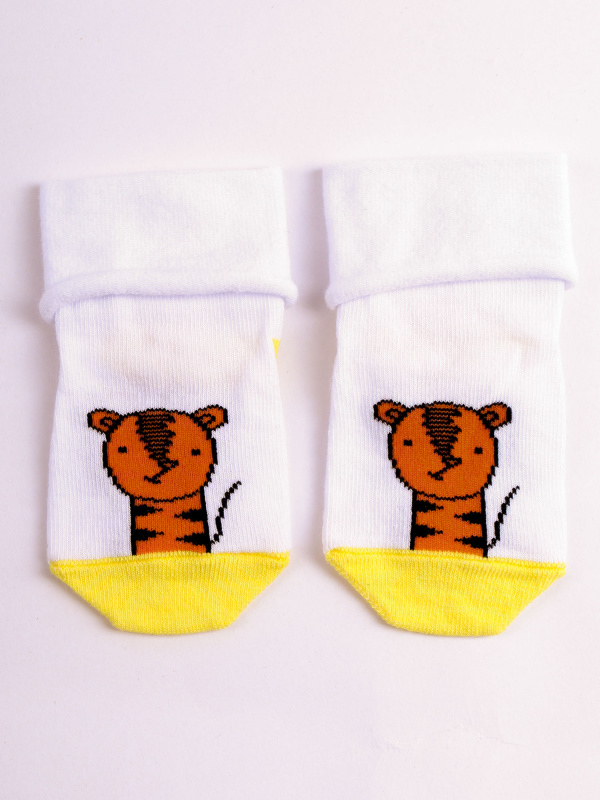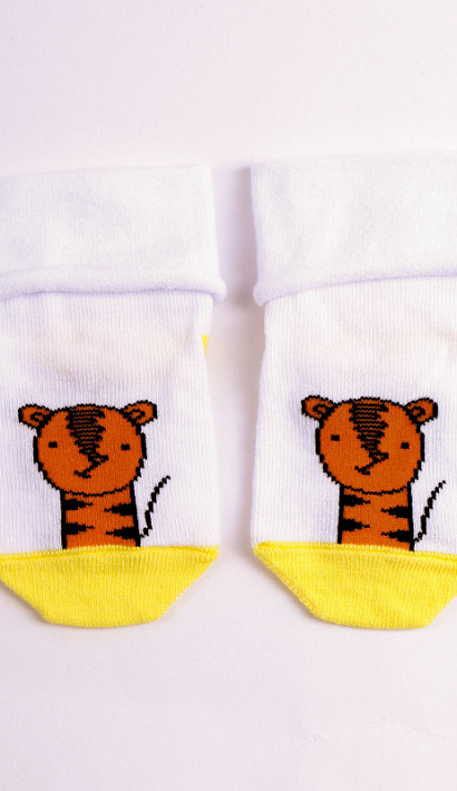 Носки детские белые с рисунком в виде тигра и желтым мыском. Обладают повышенной износостойкостью и не теряют цвет после стирки. Носочки batik могут стать отличным подарком на любой праздник.