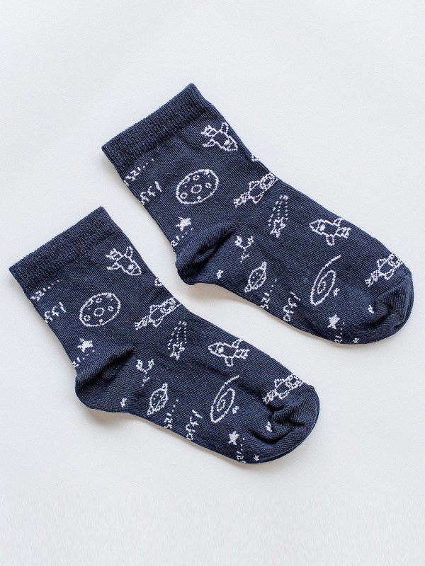 Детские носки черные с двубортной резинкой, паголенок классический, компьютерный рисунок в виде космических объектов. Это замечательный подарок для ребенка, увлеченного темой космоса. Отличный выбор для повседневной носки!