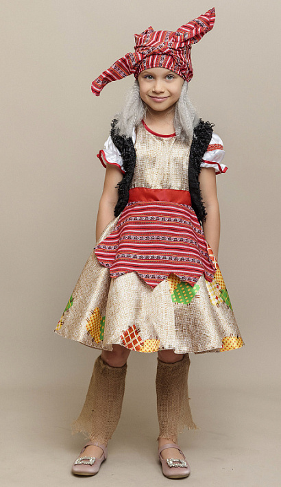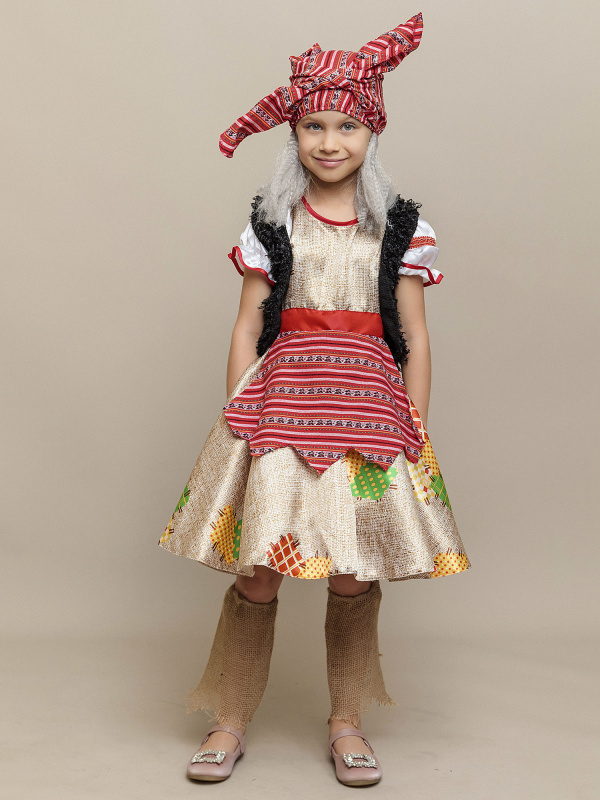 Карнавальный костюм Баба Яга для девочки – сказочный образ для харизматичных и смелых юных особ. Милая Баба Яга может прийти на новогодний утренник или поучаствовать в спектакле. Цельный образ колдуньи из русских народных сказок предоставляет бренд Пуговка. Комплект костюма Бабы Яги состоит из платья, жилета, гетр и повязки на голову.