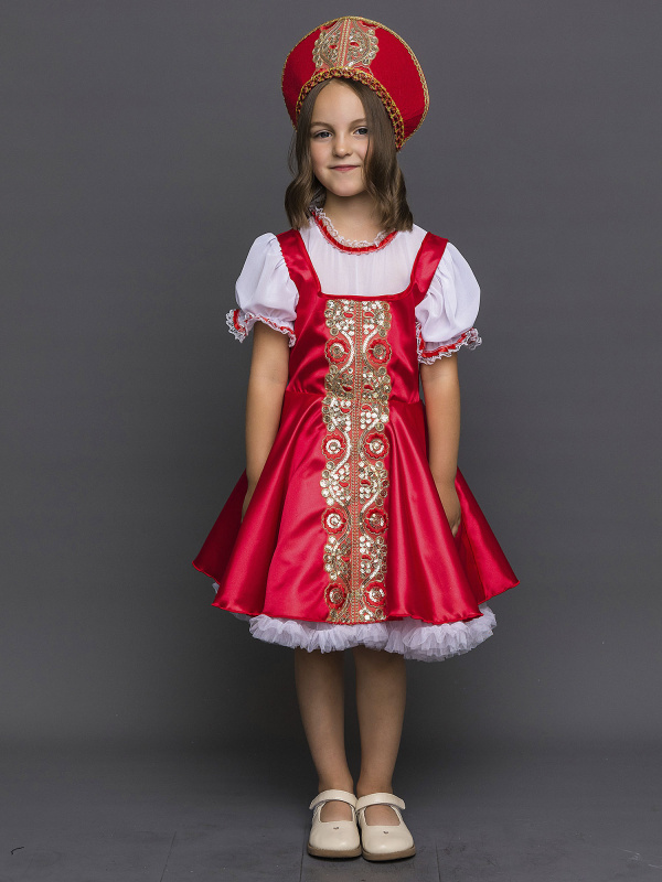 Карнавальный костюм Забавы для девочки 4-10 лет. В комплект входит красное платье с подъюбником, кокошник. Костюм украшен золотистой тесьмой.