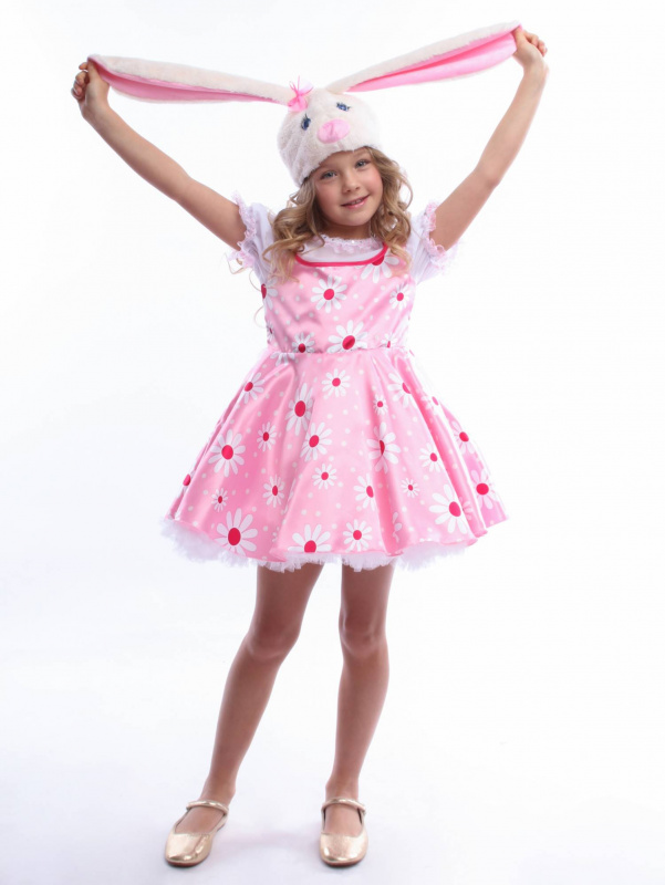 Карнавальный костюм Зайка Леля для девочки. В комплекте розовое платье и шапочка с ушками. Платье с коротким рукавом и принтом в виде цветочков. Пышная юбка , по краю рукава и воротнику оборки. Яркий и красивый наряд для праздника.