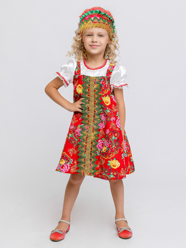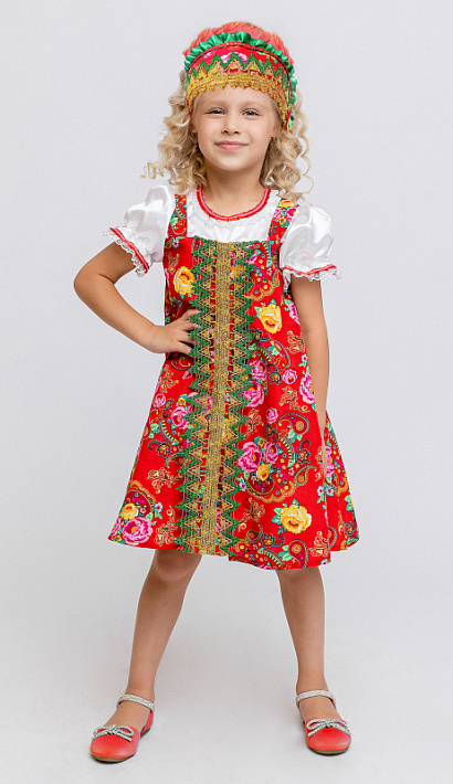 Карнавальный костюм Красна-девица детский: платье и кокошник. Девочка в таком костюме сможет почувствовать себя настоящей сказочной царевной, если она выступает на утреннике, играет в спектакле или просто идет на костюмированный праздник. Платье с короткими объемными рукавами и народным узором.