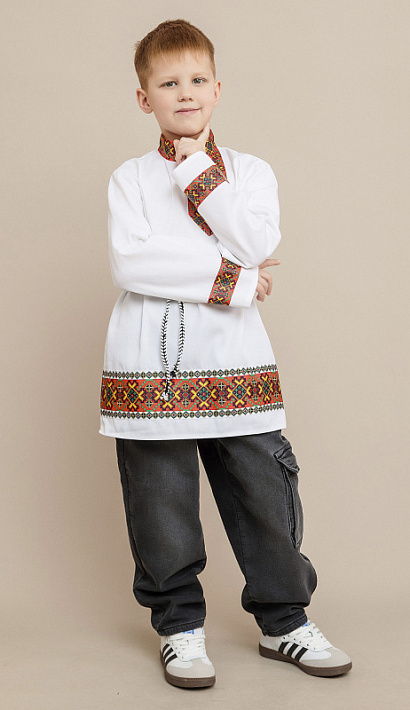В комплекте белая рубаха с национальным орнаментом – свободный крой для комфорта, украшена красочной вышивкой в народном стиле. Пояс дополняет образ, подчеркивая традиционный колорит.