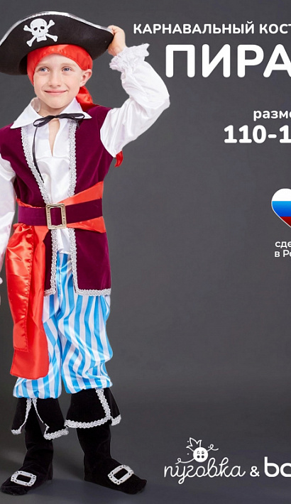 Все мальчишки обожают пиратов – этих морских романтиков, грабящих богатые суда и ищущие сундуки с золотом на неведомых островах. При них написано много книг, еще больше снято мультфильмов и фильмов. Примерить на себя дерзкий образ можно вместе с мастерской Пуговка! Карнавальный костюм Пират Спайк представляет собой классический наряд пирата 18 века, самый узнаваемый и красивый. В комплект образа входит рубашка, штаны, шляпа, бандана, сабля.