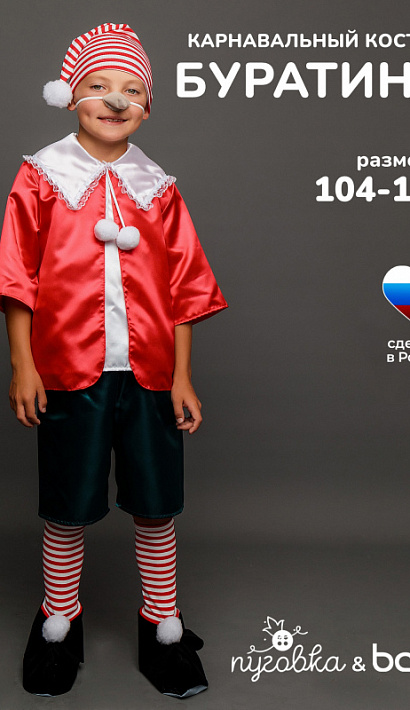 Буратино – главный герой сказки Алексея Толстого «Золотой ключик», сделанный из дерева мальчик, чьи интересные приключения также легли в основу знаменитого советского фильма. Карнавальный костюм Буратино станет наиболее удачным образом для любого мальчика. Он подойдет и для новогодней елки, и для тематического дня Рождения, и для участия в спектакле. В комплект входит рубашка, шорты, башмаки с гетрами, колпак и нос. Не ищите, как сделать костюм Буратино своими руками, купите его в Батик и сэкономьте свое время.