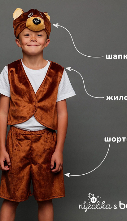 Образ славного медвежонка Потапика отлично подойдет для «домашних» мальчиков, в этом костюме они будут чувствовать себя комфортно и уютно. В таком карнавальном костюме ребенок сможет замечательно провести Новый год, а также сыграть в спектакле. В комплект образа входит жилет, шортики и шапочка.