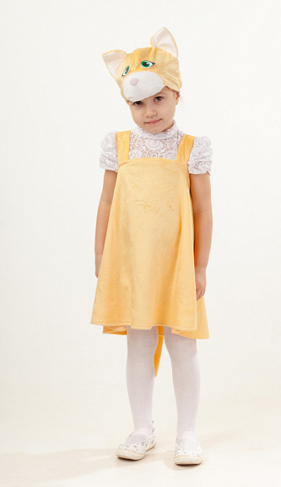 Карнавальный образ Кошка Ася состоит из сарафана и маски желтого цвета. Под сарафан можно надевать любую удобную одежду.