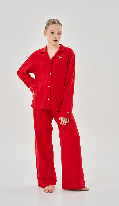 Комплект состоит из рубашки свободного кроя с длинным рукавом, оформленной принтом, и свободных брюк с декоративным бантом.