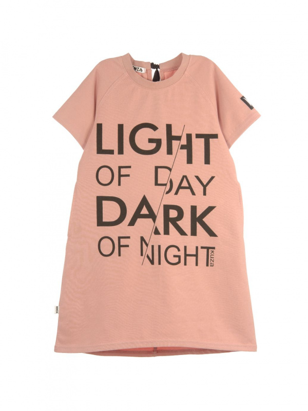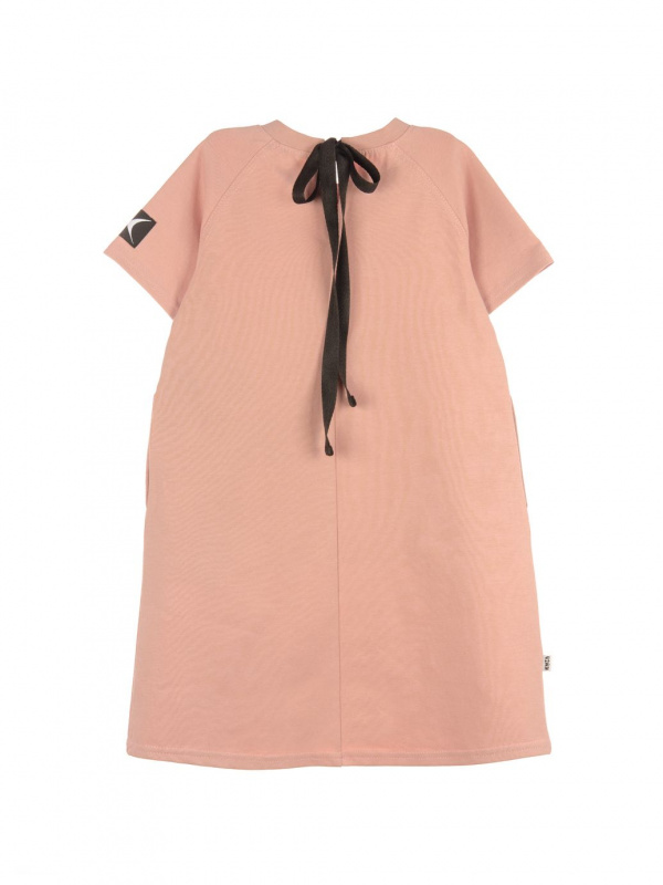 Платье с коротким рукавом, спереди принт. По спинке декоративный шов и завязка контрастного цвета. Изготовлено платье из кулирки с эластаном.