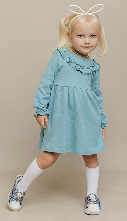 Платье с длинным рукавом в мятном цвете для девочки из натурального хлопка. Милое однотонное платье с оборками на груди и рукавах. Идеальное платье для садика и летних прогулок.