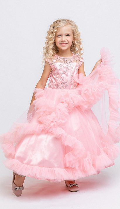 Нарядное платье с пышной юбкой из сетки. Длинное платье в яркой персиковой расцветке с цветочным узором на лифе. Подкладка 100% хлопок. Праздничное платье подойдет на выпускной в детский сад и школу. Платье выполнено из мягкого сатина с блестящим топом и пышной юбкой.