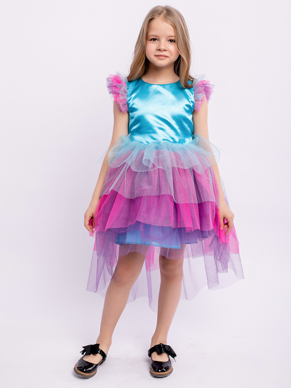 Платье Мелоди детское нарядное разноцветное. Пышная многослойная юбка со шлейфом. Блестящий атласный лиф. Короткие рукава с оборками. Завязка на спинке. Нарядное пышное платье подойдет для любого торжества.