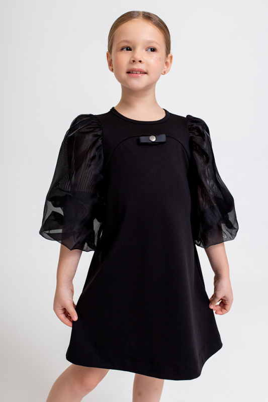 Лаконичное платье из мягкого гладкого трикотажа с объёмными рукавами из полупрозрачного капрона. Спе...