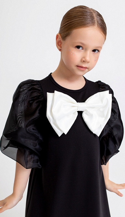 Спереди декоративный съемный бант, который можно заменить на маленький бант в тон платья (в комплекте).