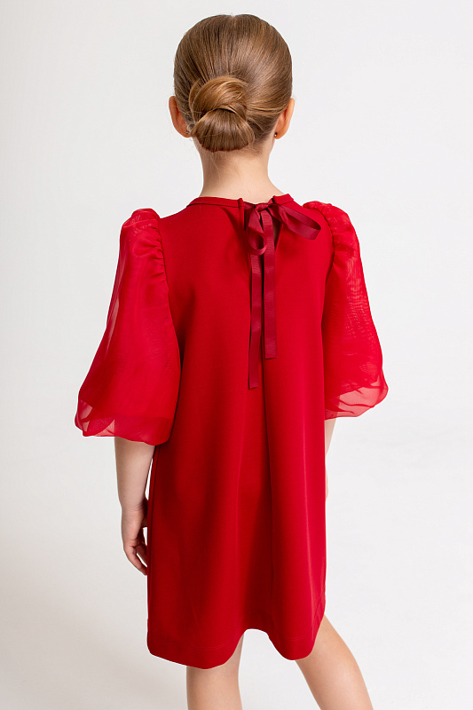 Лаконичное платье из мягкого гладкого трикотажа с объёмными рукавами из полупрозрачного капрона.