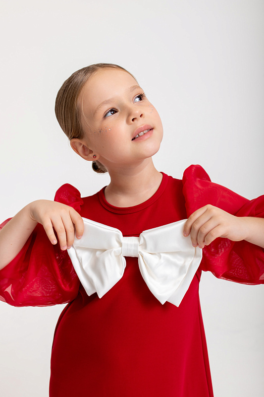 Спереди декоративный съемный бант, который можно заменить на маленький бант в тон платья (в комплекте).