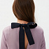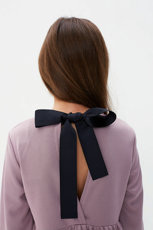На спине глубокий разрез, оформлен бантом из черной отделочной широкой ленты.