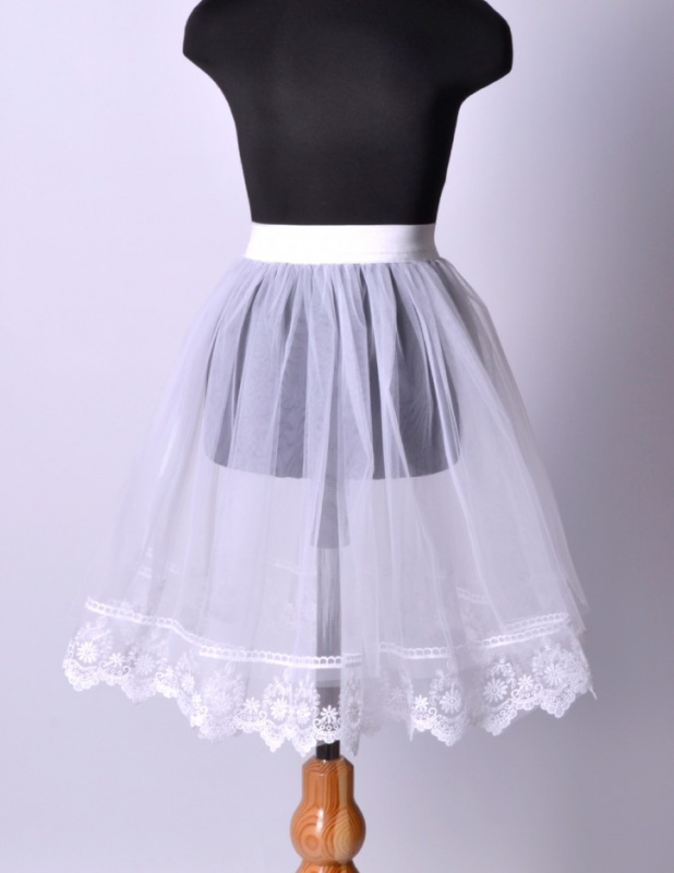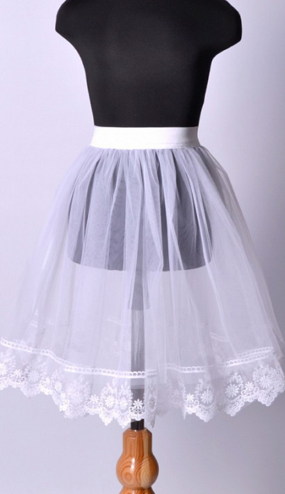 Красивый школьный подъюбник на мягкой резинке для торжественных мероприятий. Два слоя фатина для большей пышности. Цвет белый. Украшен широким кружевом на сетке по подолу.
