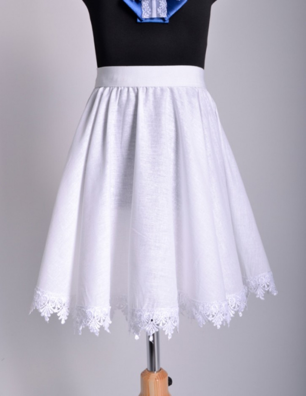 Красивый школьный подъюбник на мягкой резинке, из натуральной ткани. Придает дополнительную пышность. Однослойный. Цвет белый. Украшен широким кружевом по подолу.  Подходит для всех школьных платьев Выбирайте на один рост с платьем.