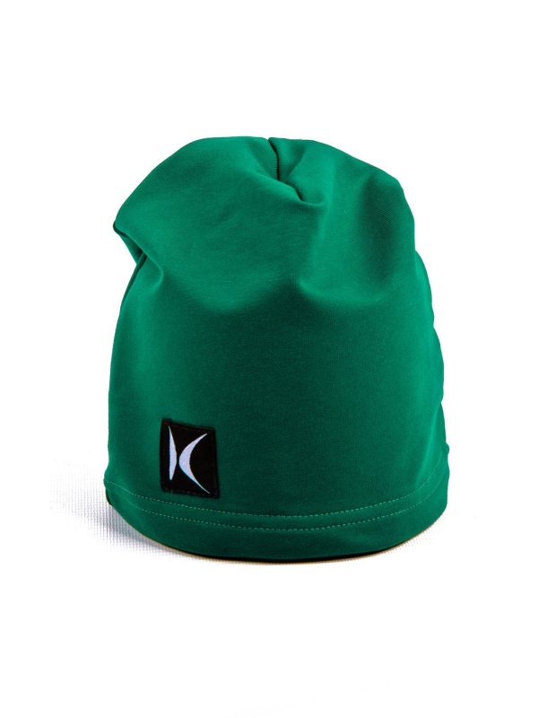 Шапка одинарная. Сбоку декоративный элемент. Изготовлена из футера с эластаном, без начеса.