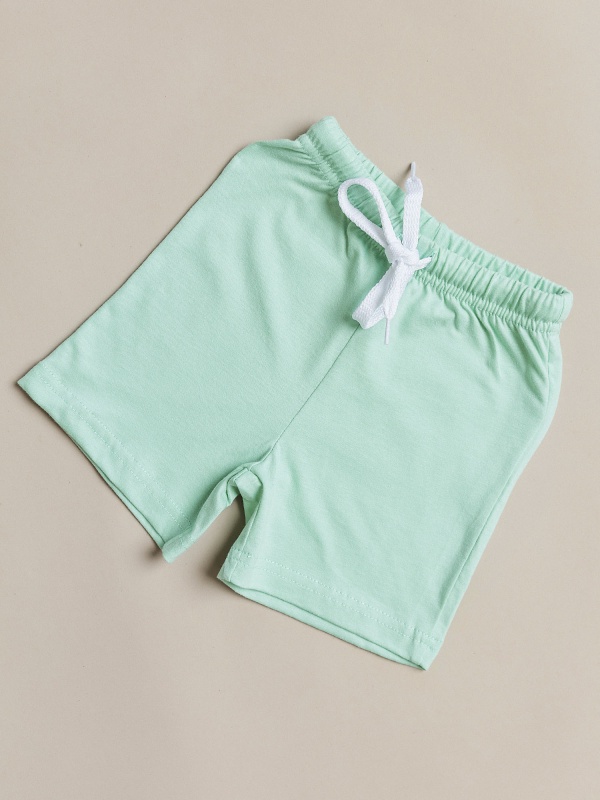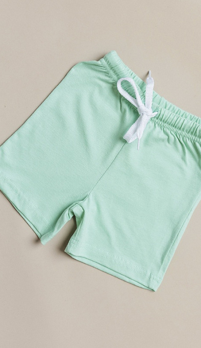Шорты для мальчиков в ментоловой расцветке из натурального хлопка. Прямой крой, эластичный пояс на резинке со шнурком, без карманов. Шорты отлично подойдут для физкультуры и повседневной носки.