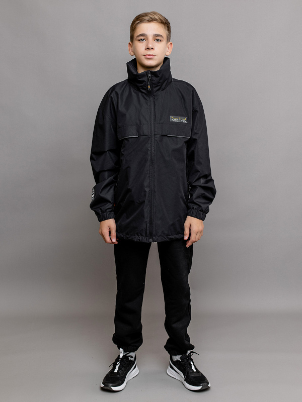 Ветровка для мальчика Гудвин в стиле спорт-шик в черном цвете. Капюшон-трансформер сворачивается в воротник, а спереди накладные карманы на молнии. Курточная ткань с водоотталкивающим покрытием DWR. На рукавах манжеты на резинке.
