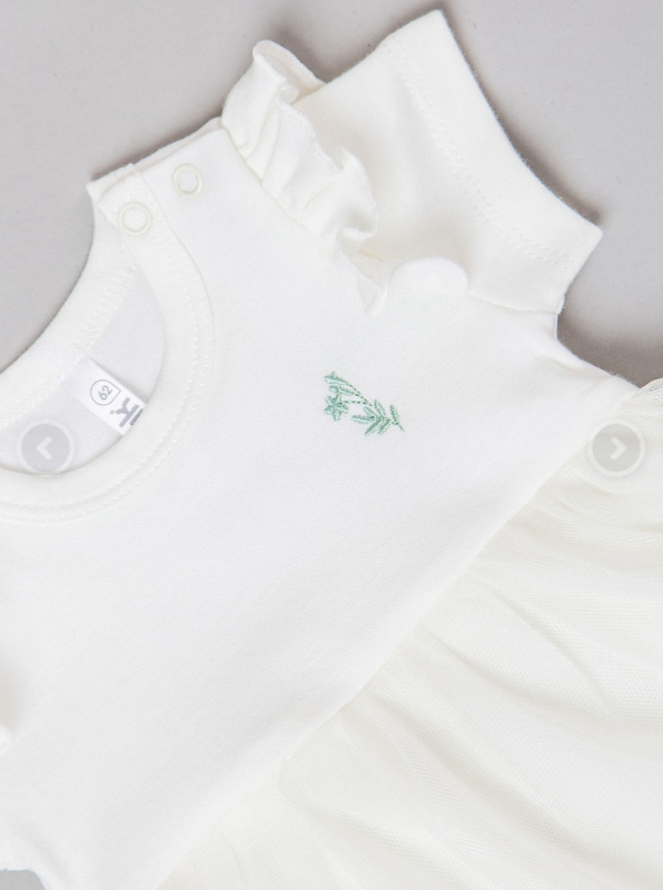 Боди с коротким рукавом для девочки белый. Детский боди из трикотажного полотна (интерлок, 100%хлопок) с застежкой по плечевым сгибам на 2 кольцевые кнопки и с застежкой по нижнему краю на 3 кольцевые кнопки. Горизонтальный подрез по линии талии, в который с присбориванием вшита юбка из фатина.