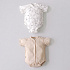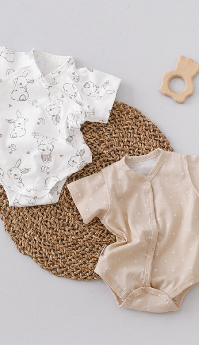 Одно боди имеет застежку на кнопки спереди и снизу для смены памперса. Второе - с запахом, с кнопочками наискосок.