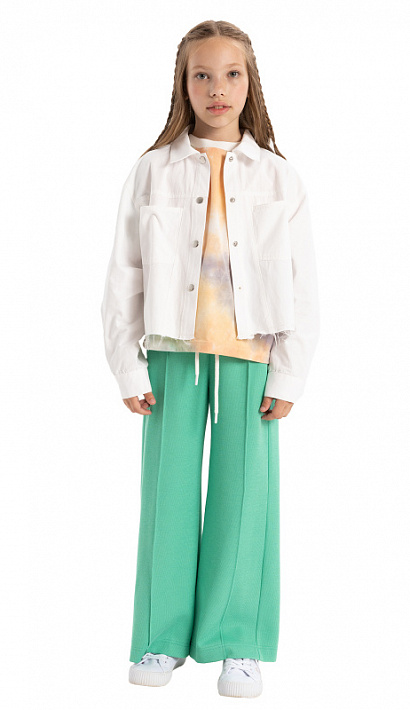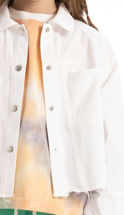 Укороченная куртка-джинсовка в стиле оверсайз из плотного хлопка, застежка на кнопки, воротник с цельнокроеной стойкой, спущенное плечо, длинные двухшовные рукава с притачными манжетами и застежкой на кнопку, на полочках кокетка, рельефы и два кармана, на спинке кокетка, необработанный нижний срез.