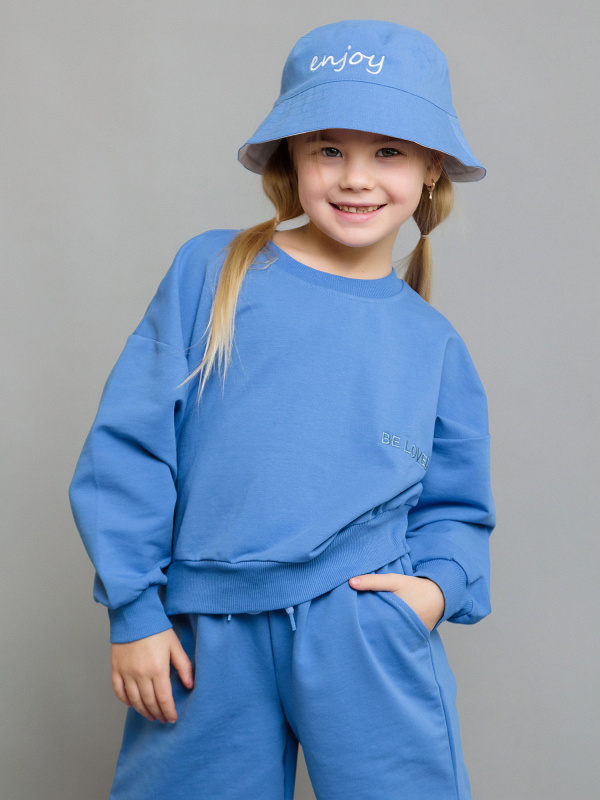 Свитшот укороченный детский в голубом цвете из футера. Стильная и удобная модель для мальчика и девочки с вышитой на груди надписью в тон основному оттенку. Манжеты рукавов и низ эластичные.