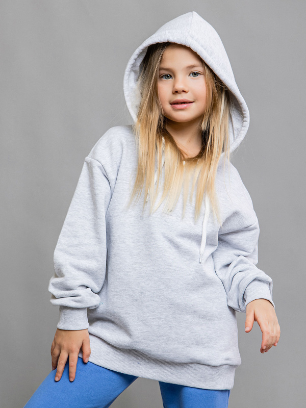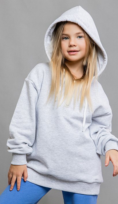 Худи детское в расцветке светло-серый меланж с капюшоном. Спущенные рукава свободного кроя и эластичные манжеты на рукавах. Модель выполнена из первоклассного гипоаллергенного футера, состоящего на 100% из натурального хлопка.